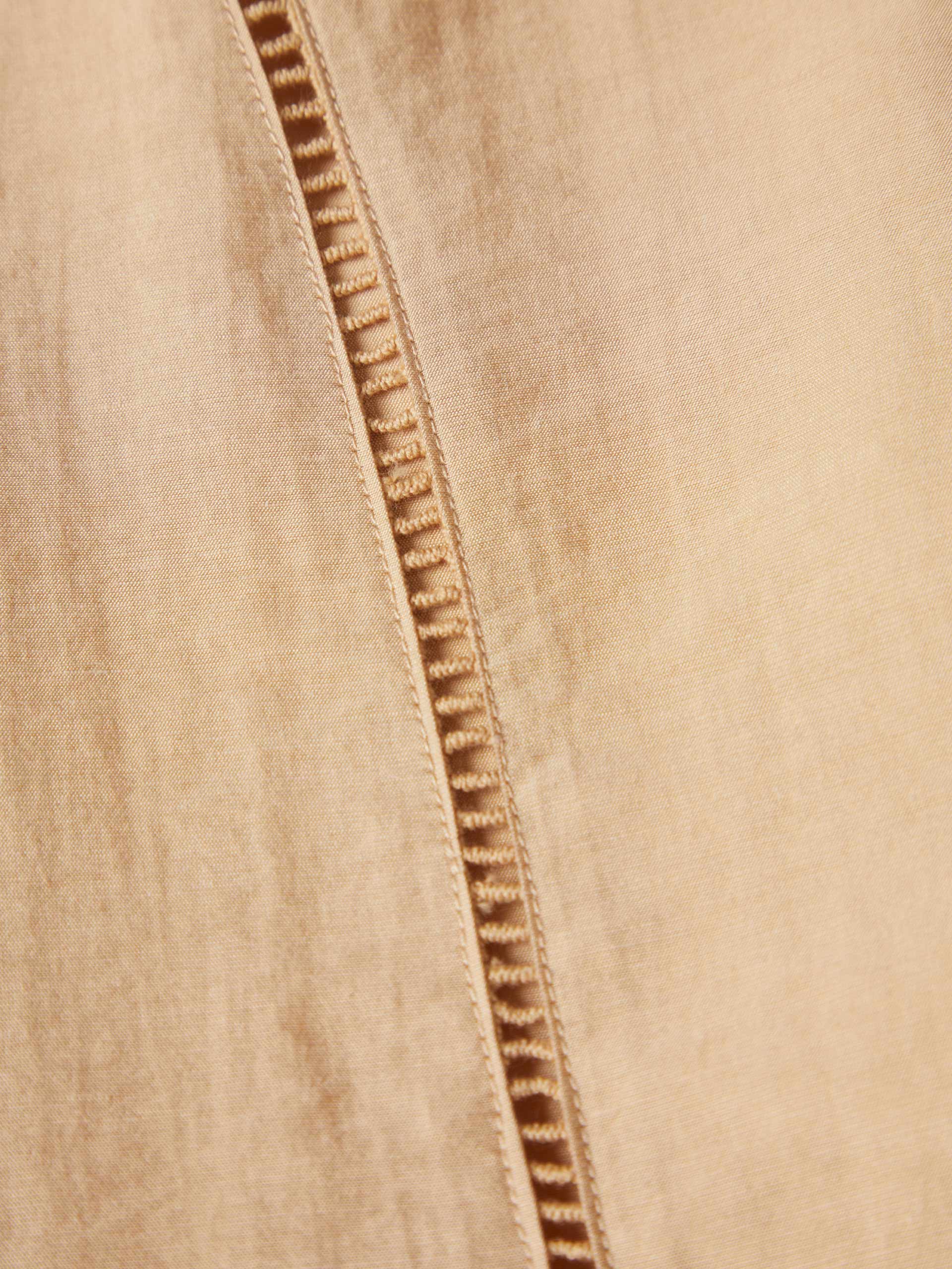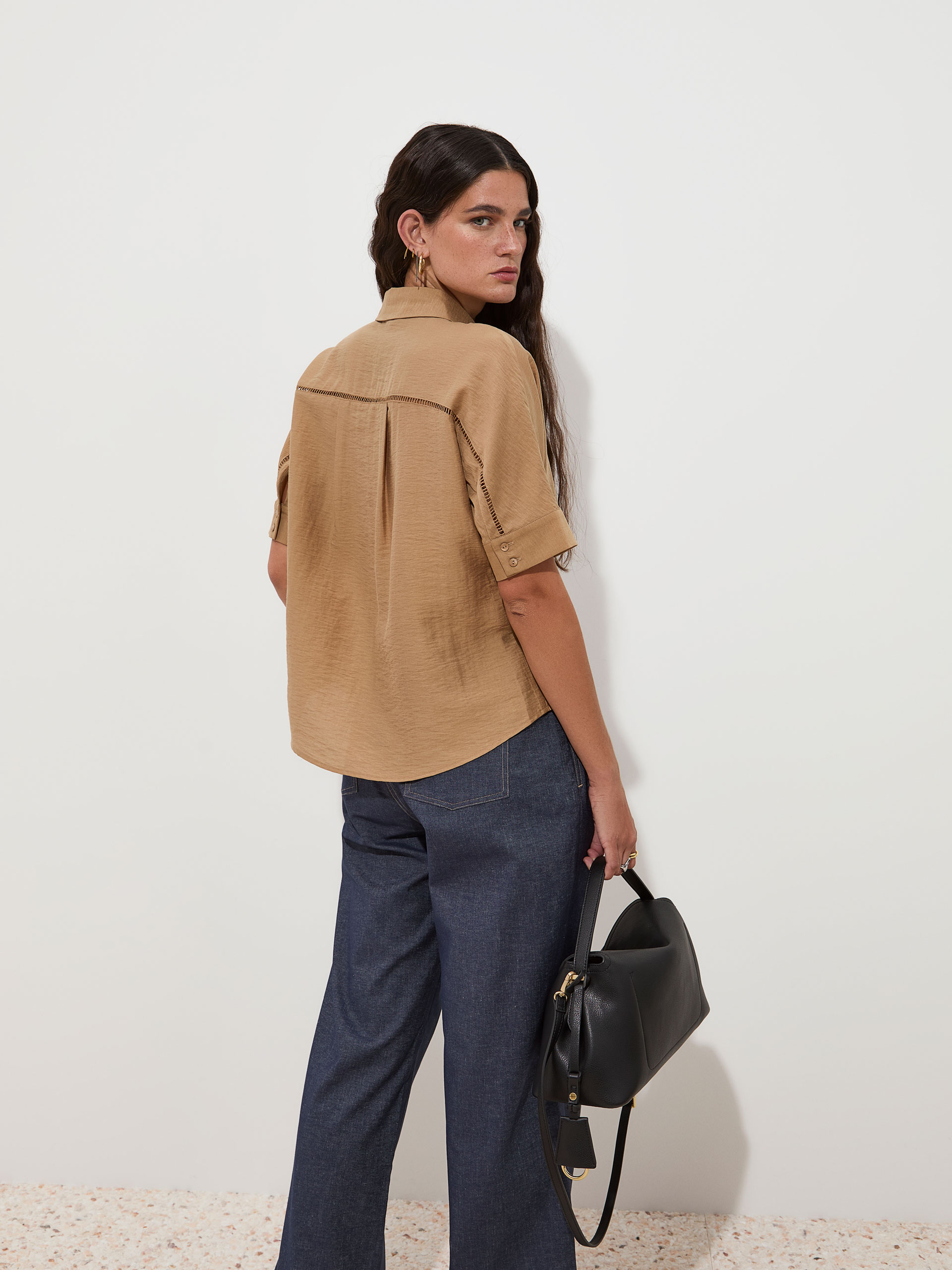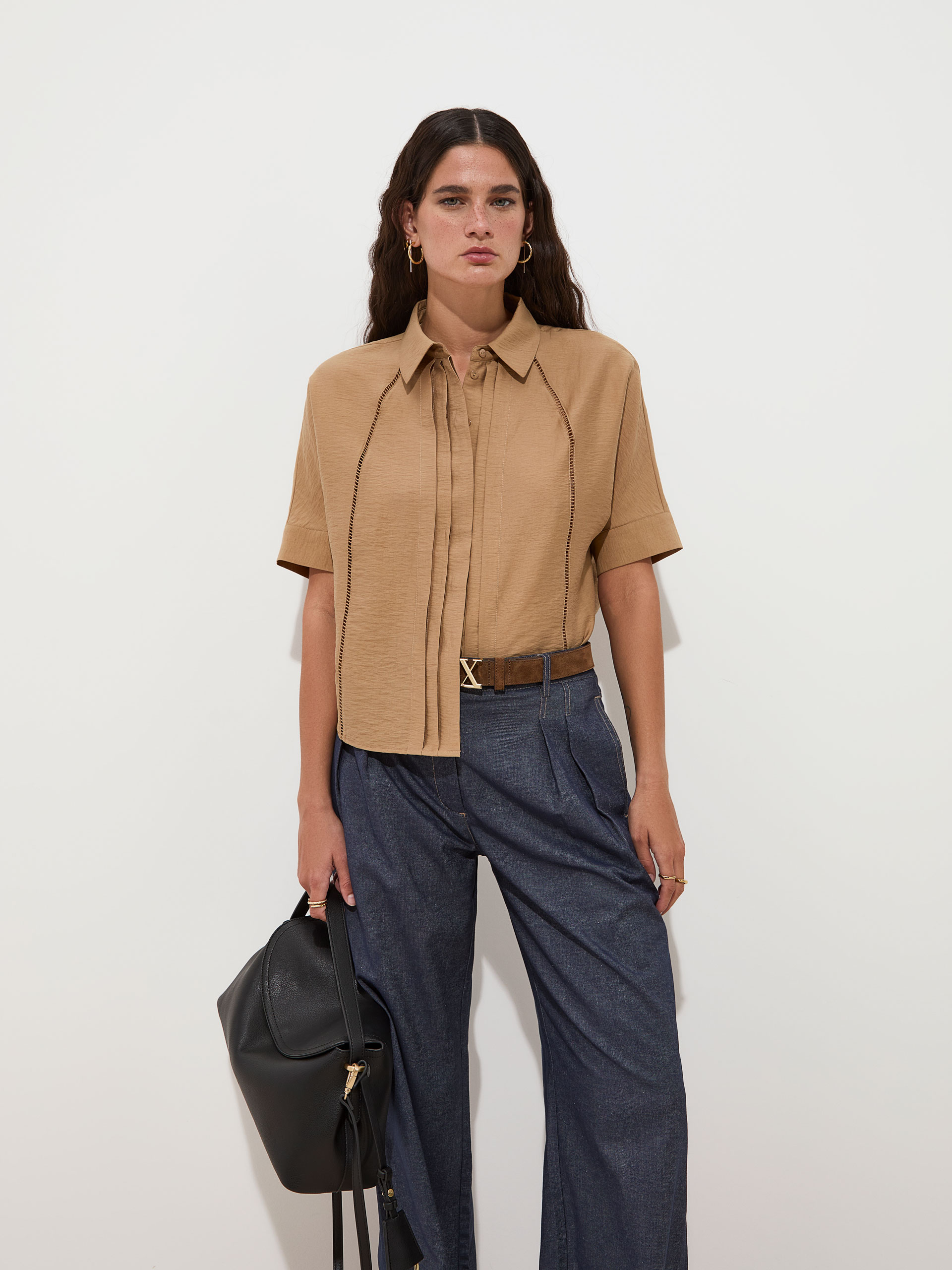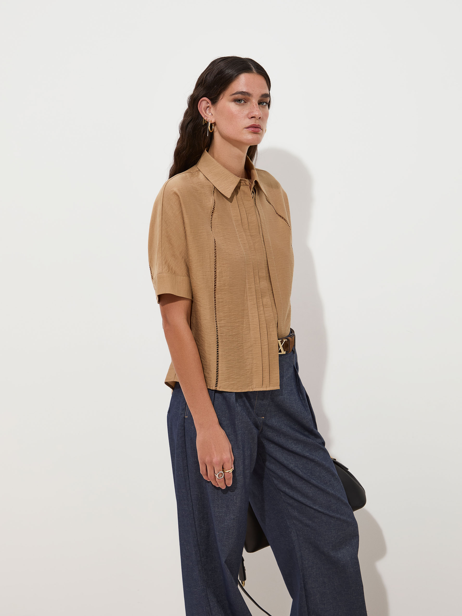 Blusa fluida confeccionada em mistura de liocel e linho, garantindo leveza, conforto e um caimento natural. Apresenta mangas morcego, abertura frontal com botões ocultos e detalhes de delicados recortes, acrescentando um toque distinto e movimento à peça. As pregas frontais e o detalhe central nas costas contribuem para uma silhueta elegante, enquanto os punhos abotoados com dois botões personalizados finalizam o design. Uma peça versátil, perfeita para looks contemporâneos e femininos.