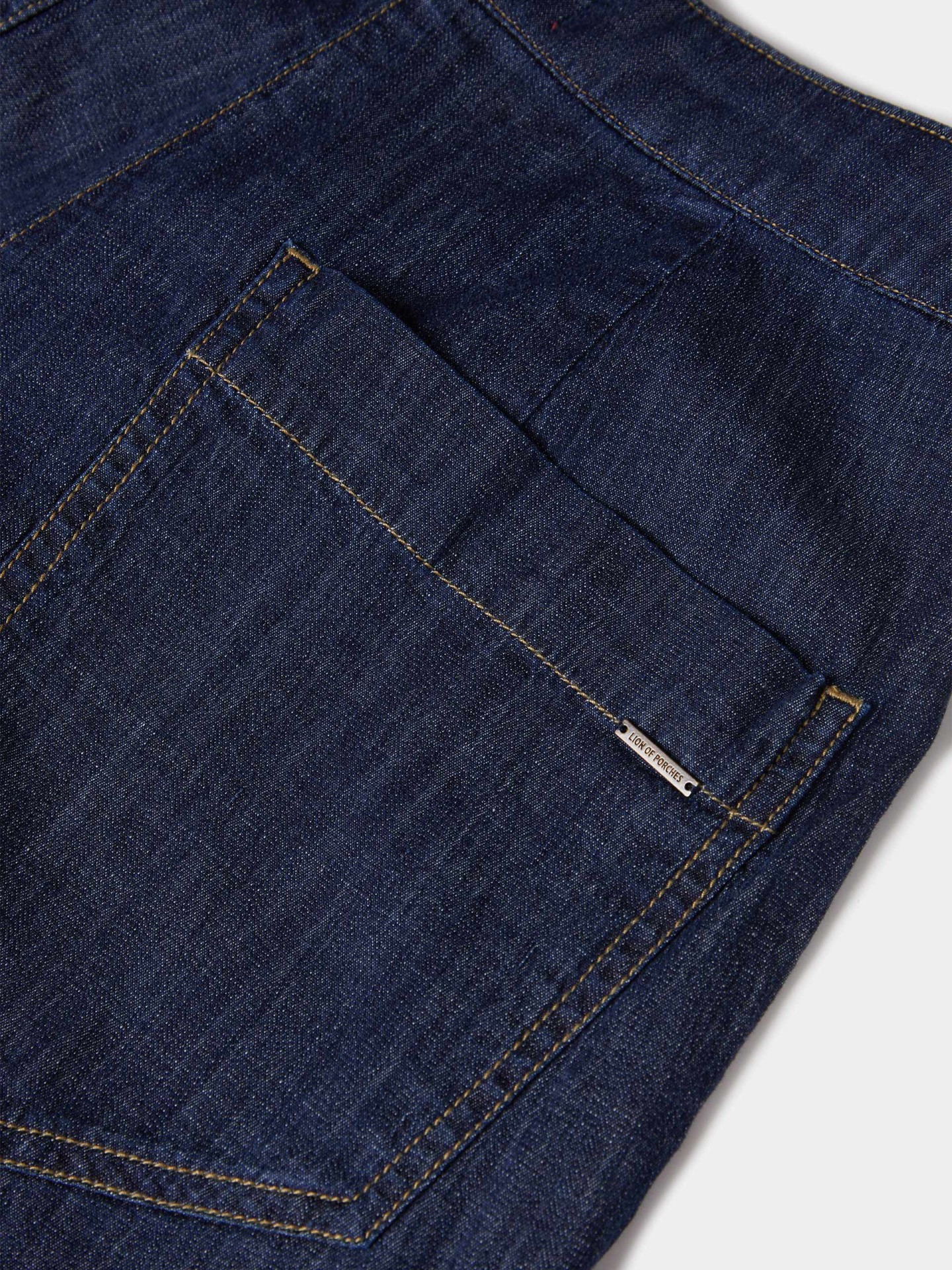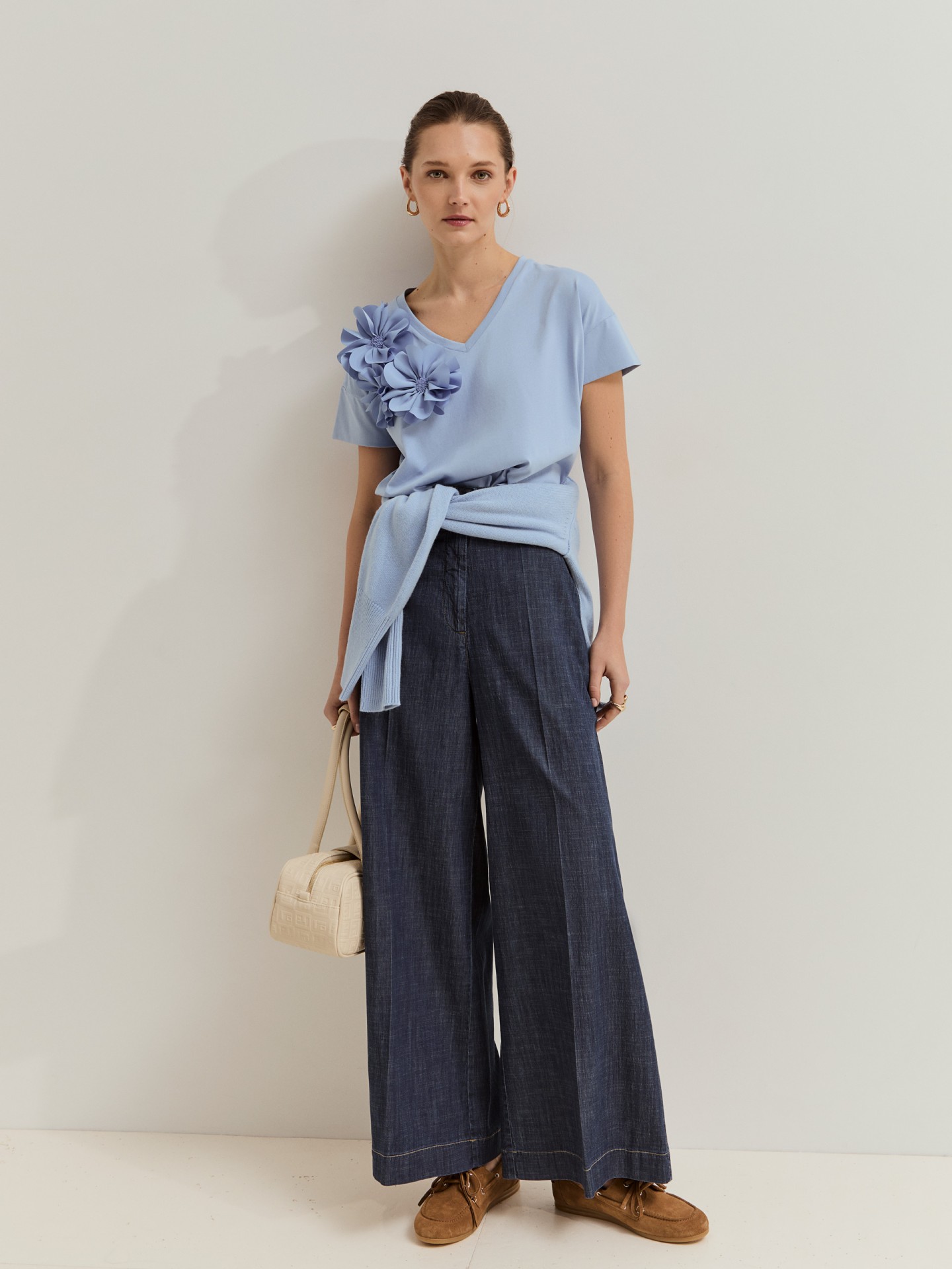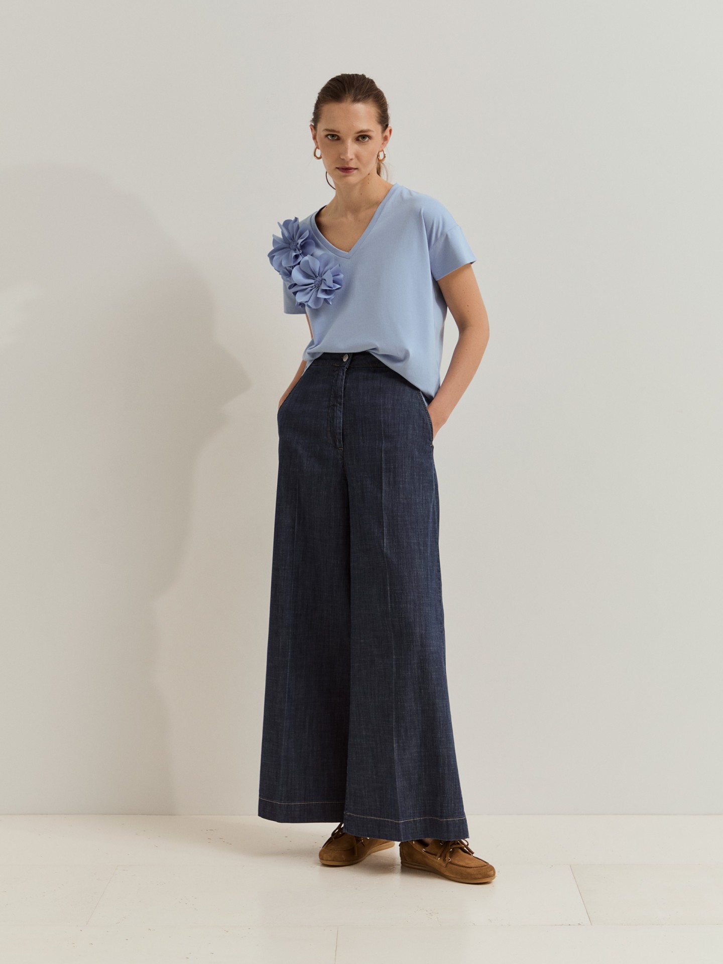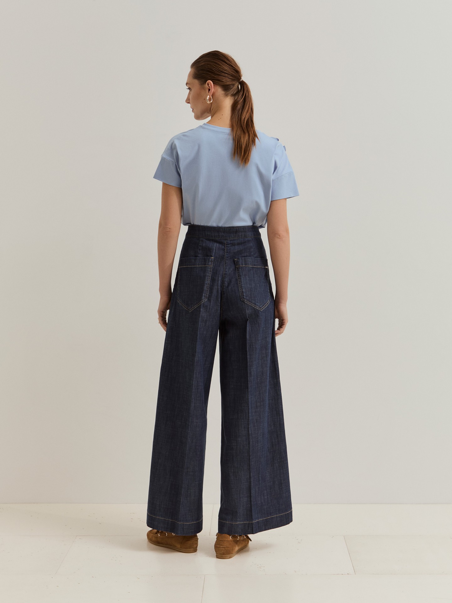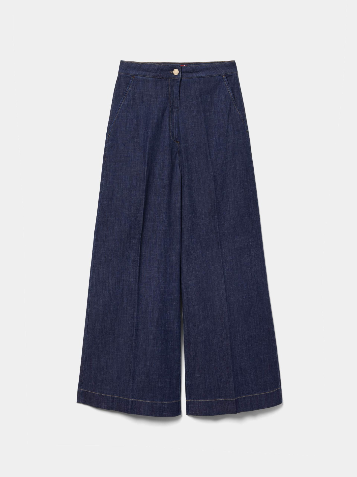Calças de perna larga, em corte oversized, confeccionadas em ganga de mistura de algodão e liocel, com um toque de elastano que garante maior conforto e liberdade de movimentos. Apresentam dois bolsos de faca na frente e dois bolsos atrás combinando funcionalidade com um visual moderno e descontraído. Uma peça versátil, ideal para looks contemporâneos do dia a dia.
