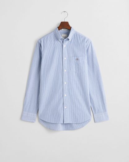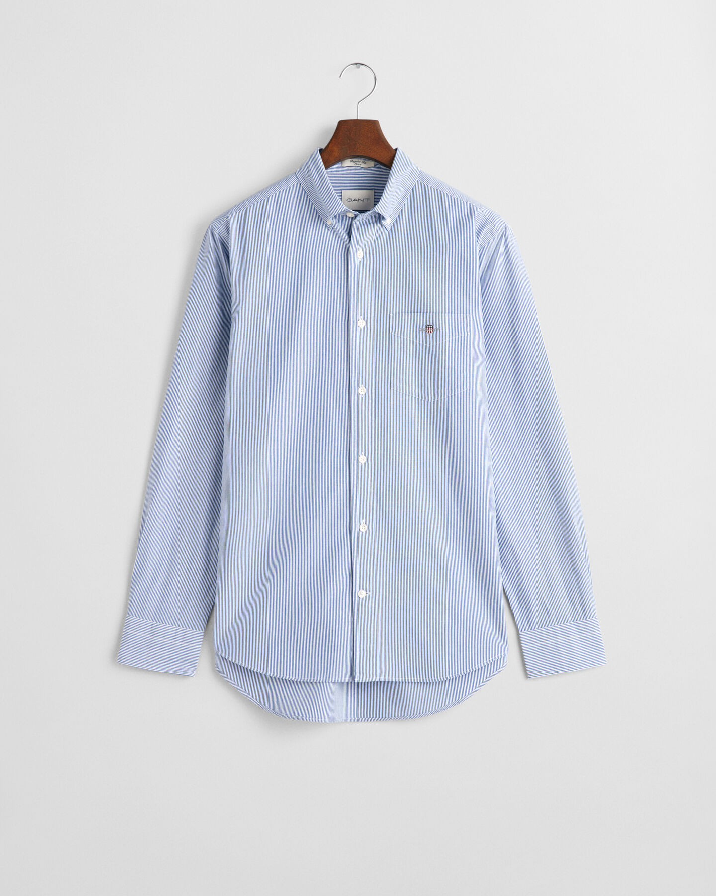 Concebida em popeline de algodão resistente, esta camisa clássica é uma peça essencial em qualquer guarda-roupa. Com riscas finas clássicas por toda a peça, esta camisa de corte normal possui um colarinho com botões, bainha arredondada e uma presilha na parte de trás. Está decorada com o logótipo bordado GANT inspirado nos anos no bolso ao peito.