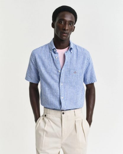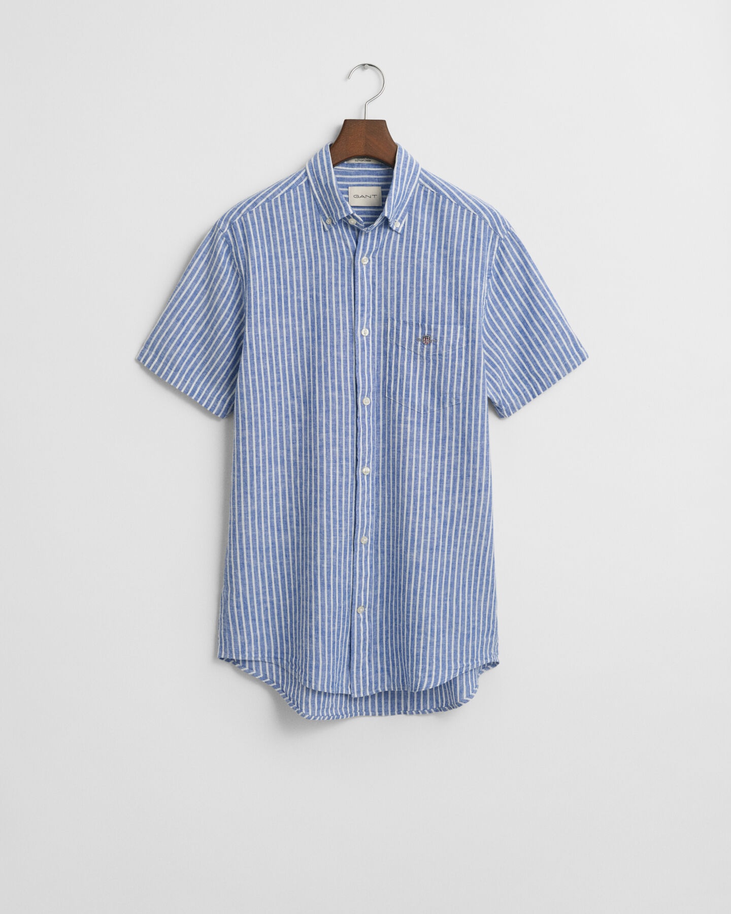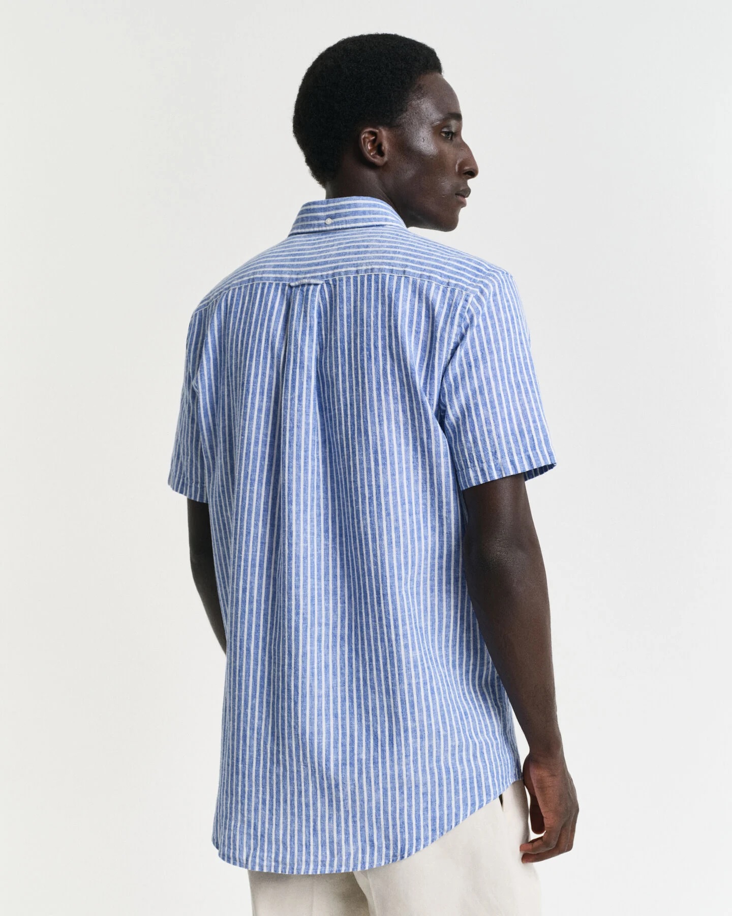Feita numa mistura de algodão e linho fresco, esta camisa é leve, respirável e arejada. Com um corte normal, possui mangas curtas para enfrentar o calor dos meses de verão. Com um padrão às riscas tingidas, possui um colarinho com botões, bainha arredondada, bolso do peito com bordado da marca e uma prega e presilha na parte de trás.