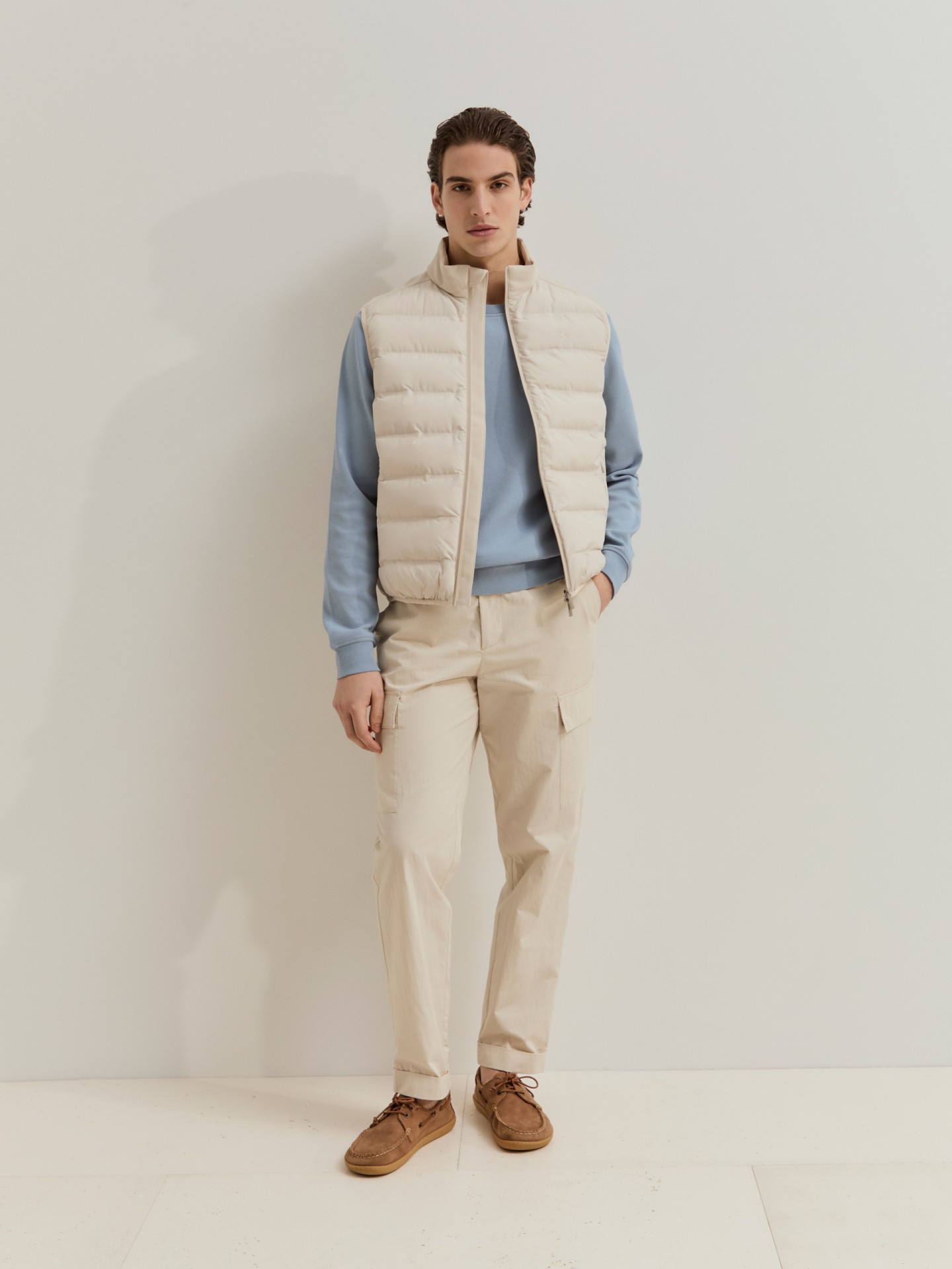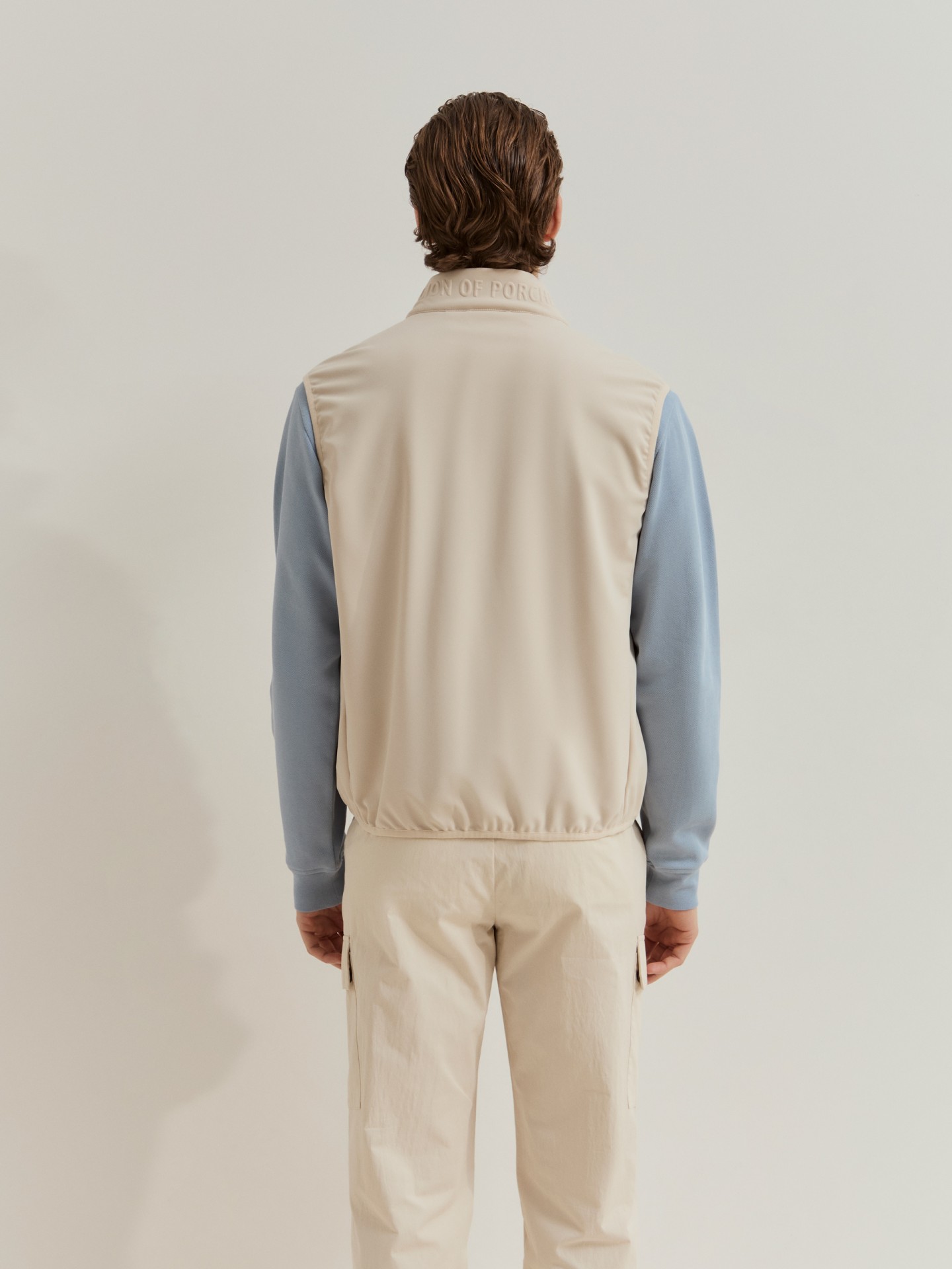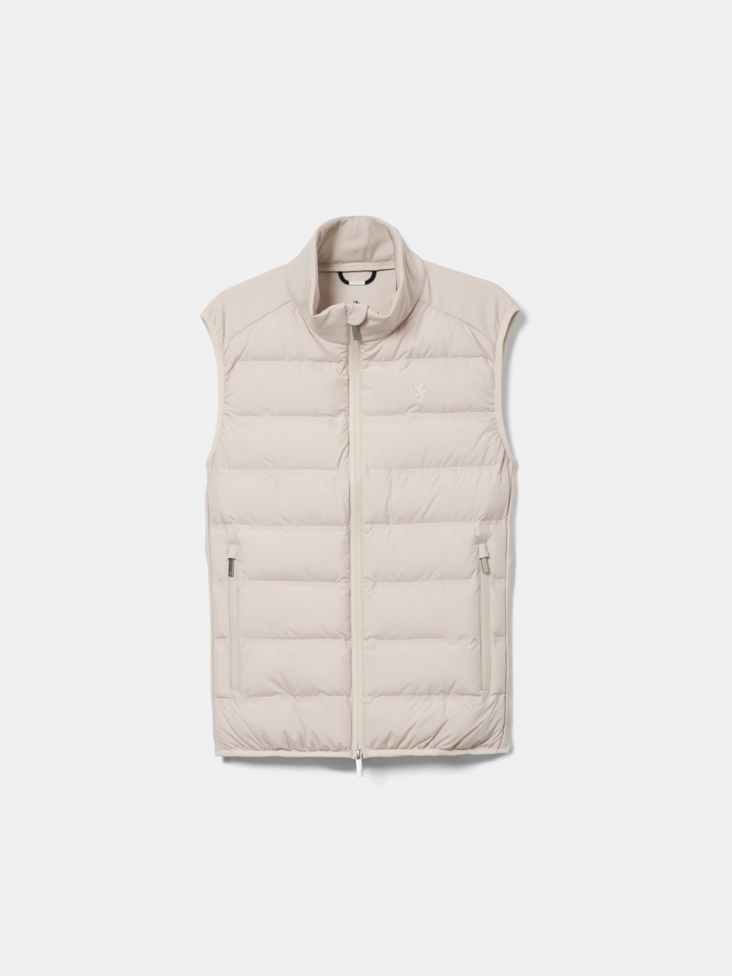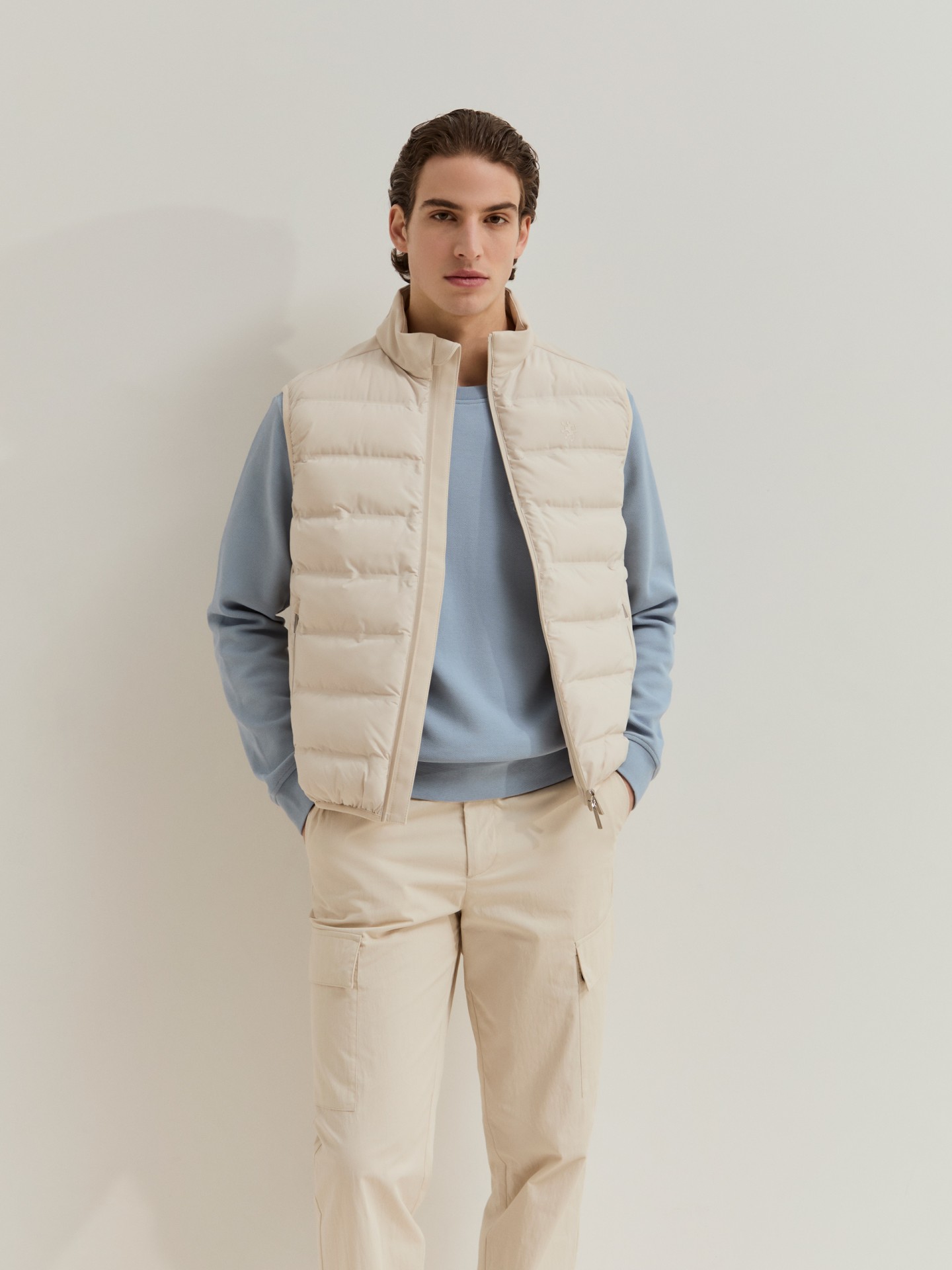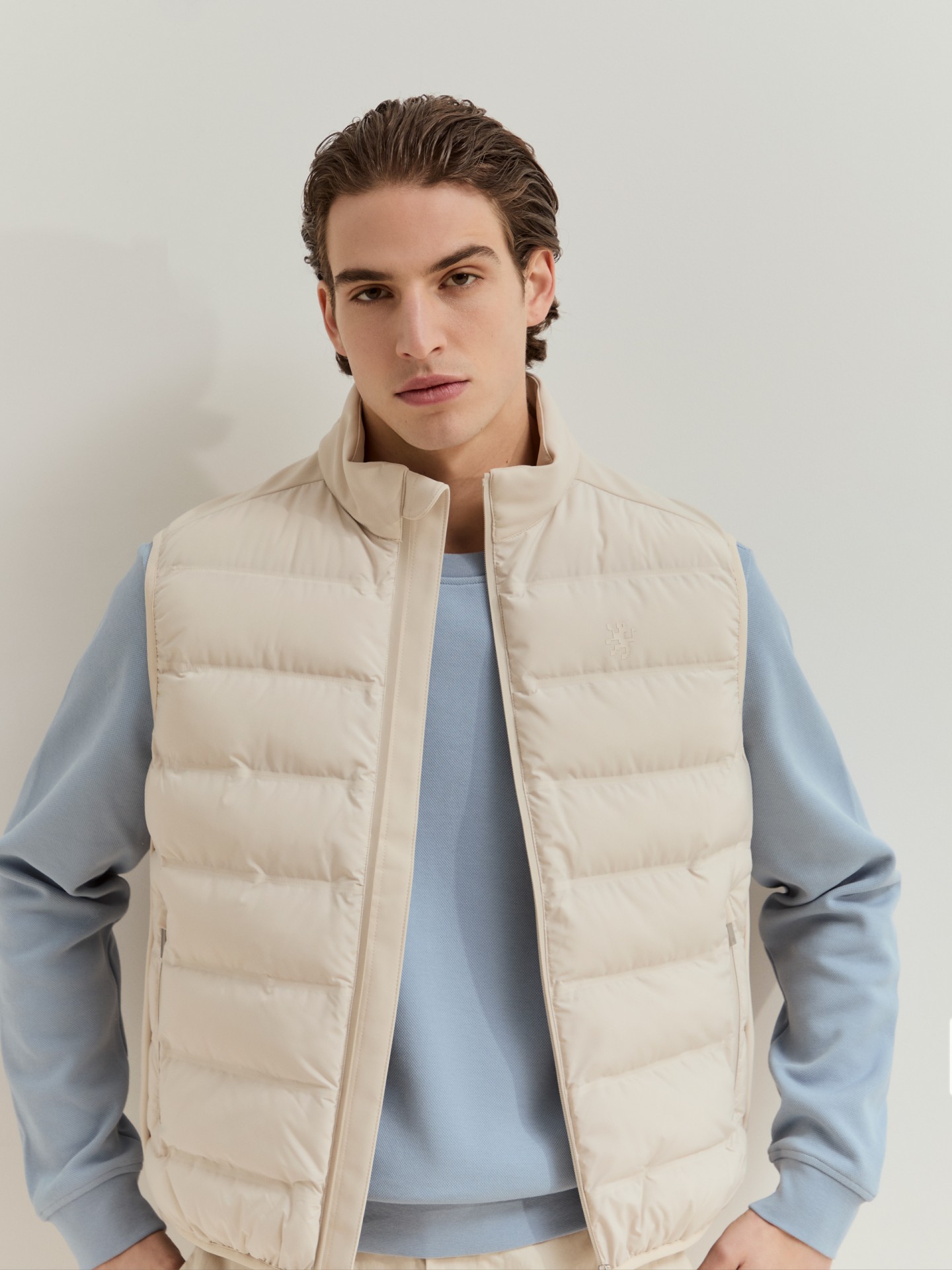 Colete com frente acolchoada, pensado para oferecer proteção e conforto térmico nos dias mais frescos. Apresenta meia gola com relevo, acrescentando um detalhe distintivo ao design. Aperta à frente com fecho de correr duplo impermeável e inclui bolsos frontais igualmente impermeáveis, garantindo funcionalidade e praticidade.
