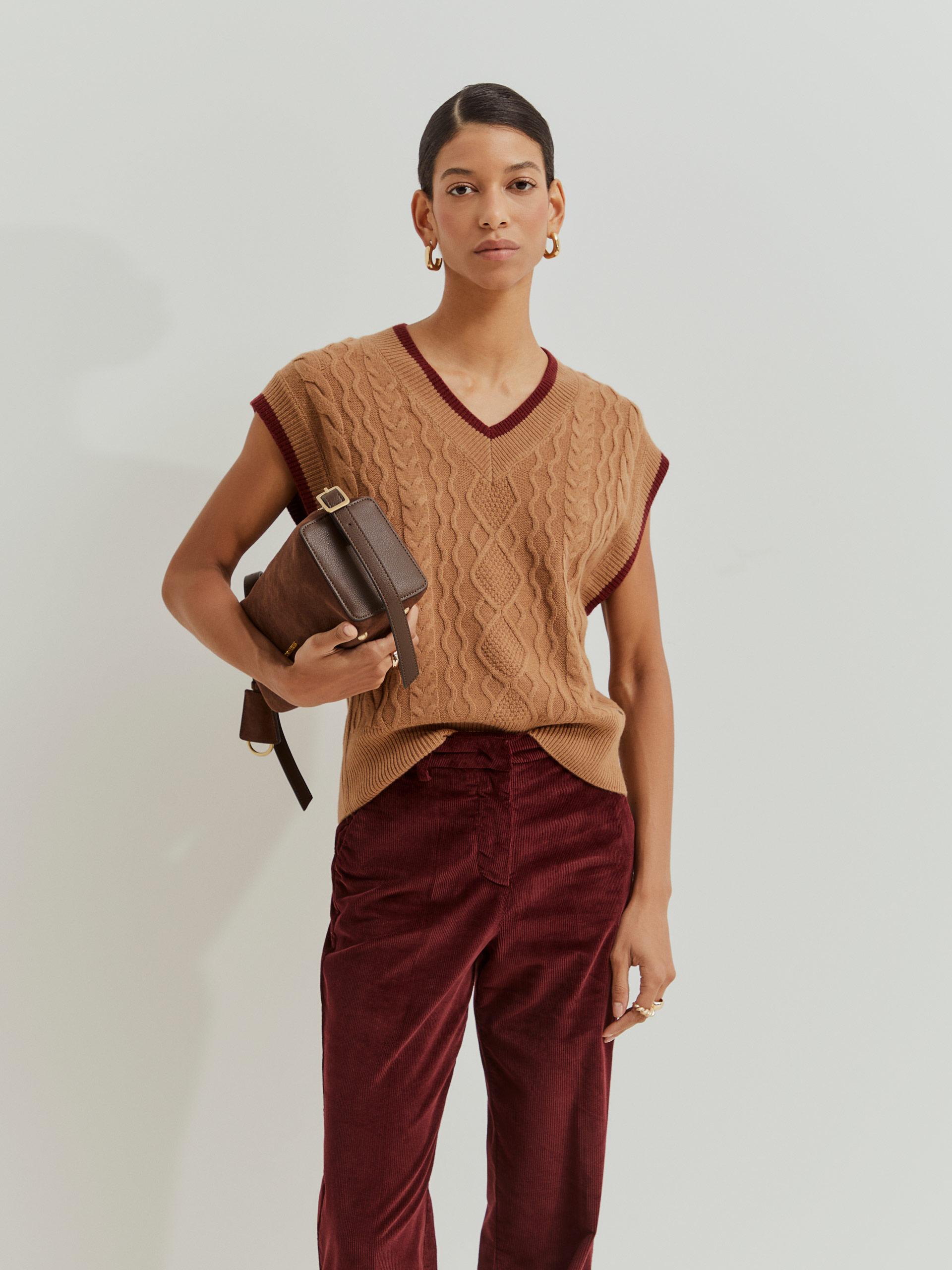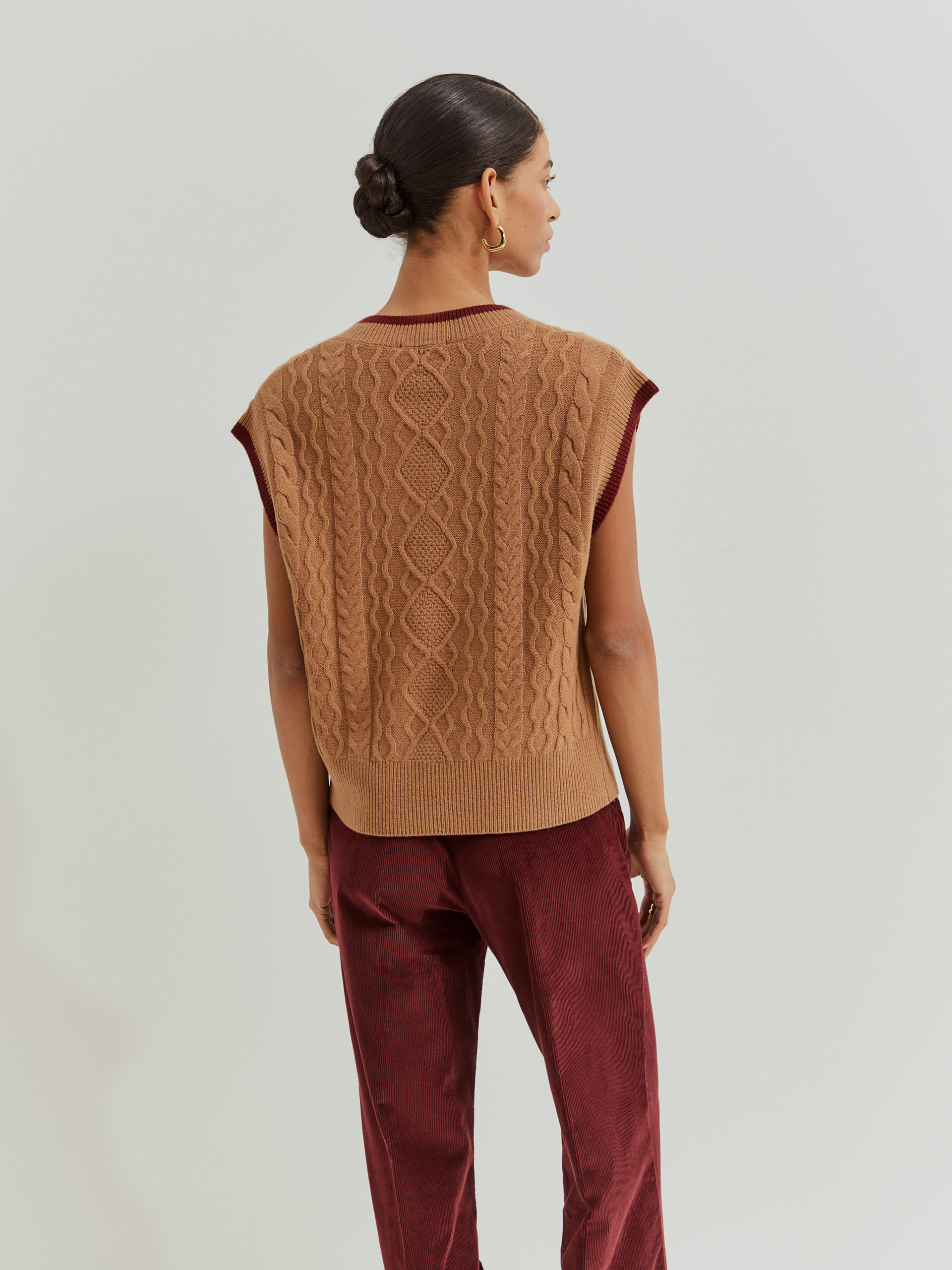 Colete de malha tricotada com decote em V, realçado por linhas em contraste de cor no decote e nas cavas. Uma peça versátil que combina facilmente com camisas, blusas ou camisolas, trazendo um toque moderno e elegante a qualquer look.
