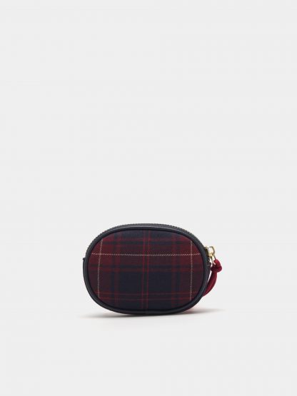 Porta-moedas em formato oval com aplicação metálica Lion of Porches. Fecho superior com zíper e fita vermelha em contraste com o estampado xadrez vermelho.