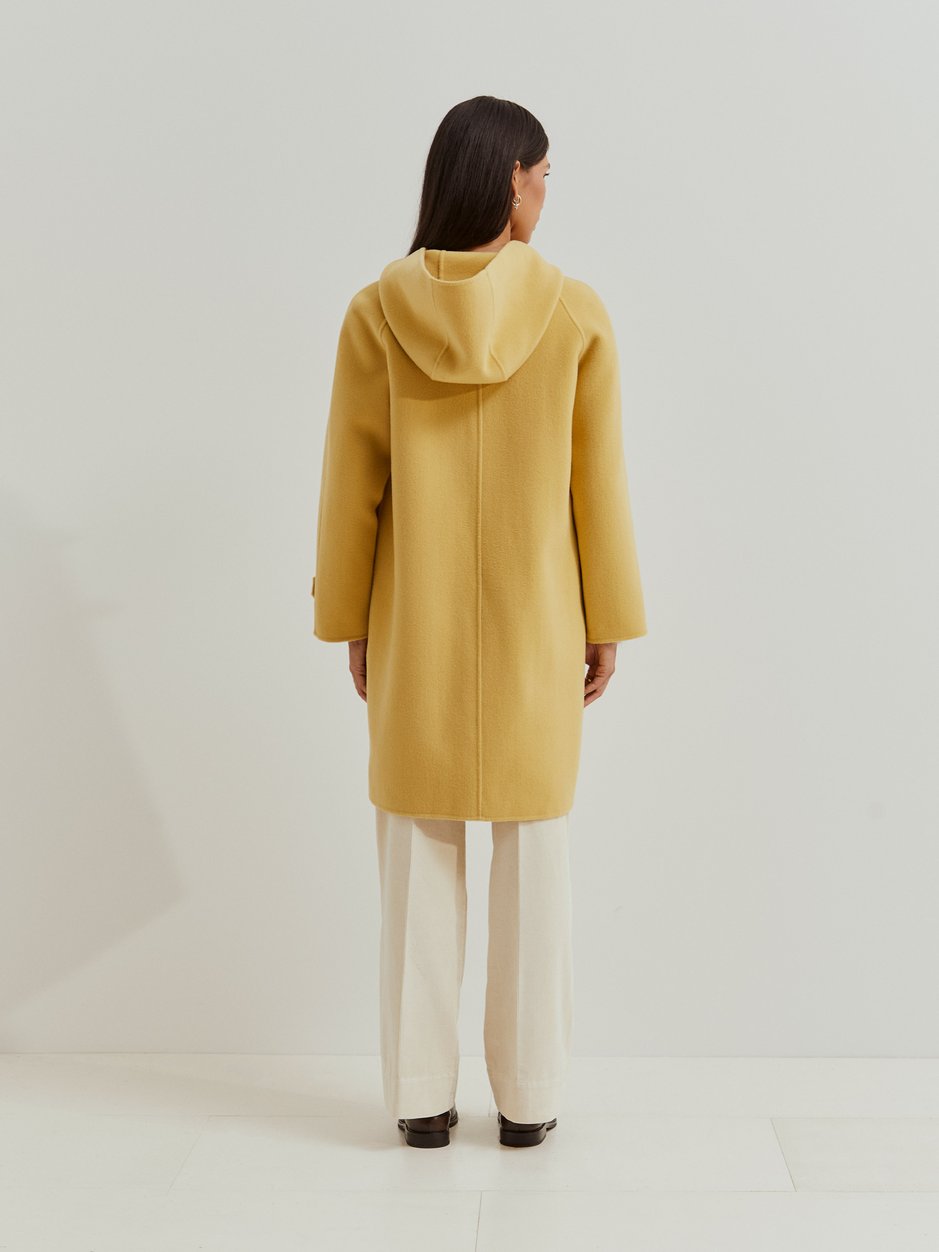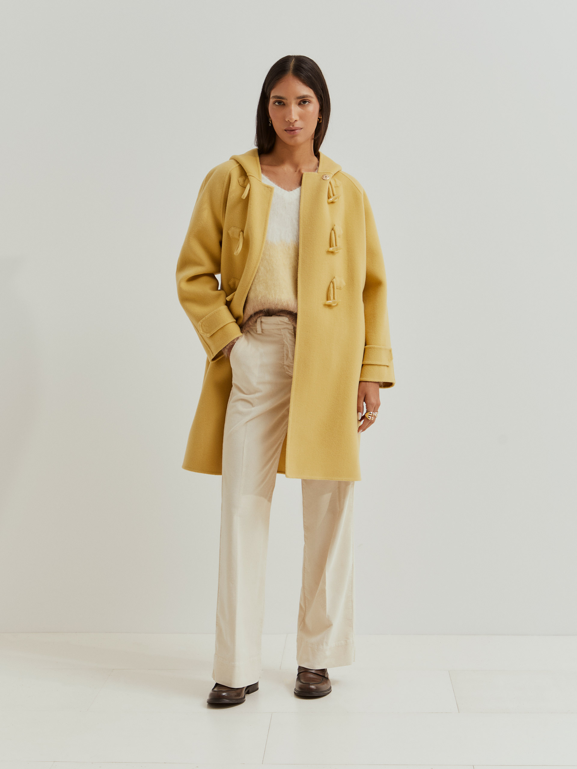 Confecionado na totalidade em lã, este sobretudo apresenta um design clássico e funcional. O modelo distingue-se pelo fecho em toggle que confere um toque vintage e prático. Inclui capuz, ideal para dias frios, e bolsos laterais discretos.